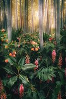 digitaal fictief bos met bloemen en dramatisch licht