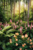 digitaal fictief bos met bloemen en dramatisch licht