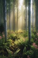 digitaal fictief bos met bloemen en dramatisch licht
