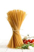 bosje volkoren spaghetti dat zich op wit hout bevindt met wat tomaten en kruiden die tegen een witte achtergrond zijn geïsoleerd, kopieerruimte, geselecteerde focus