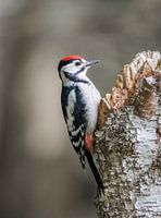 Portret van een mannelijke grote bonte specht op een afgebroken stam in het bos, met een grijs groene bokeh achtergrond. De foto is gemaakt vanuit een vogelhut.