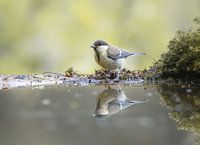 close up van een juveniel koolmeesje bij een plas in het bos, waar je de reflectie ziet in het water, met een pastelgroene achtergrond. De foto is gemaakt vanuit een vogelhut.