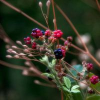 Dit is een takje van een bramenstruik met jonge onrijpe bramen en één rijpe braam. Het is een herfsttafereeltje met warme kleuren. De foto heeft weinig scherptediepte en het licht valt mooi op de bramen. Dit werk combineert mooi met de werken "bloem met kanten randje" en "uitgebloeide witte bloemklokjes".
