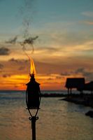 Als de zon ondergaat zorgen de oliebranders voor sfeer tijdens de vakantie op Curacao.