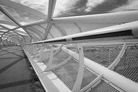 bijzondere architectuur en lijnenspel van de brug "de Groene Verbinding" bij Rhoon en Rotterdam - Zuid. Deze fiets- en voetgangersbrug overspant de A15 en de Betuwelijn. Het ontwerp van de brug - ook wel " de Netkous" genoemd - is van Marc Verheijen van Gemeentewerken Rotterdam.