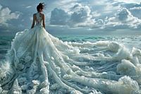 bruid in de branding waarbij haar jurk overgaat in de golven van de zee ai