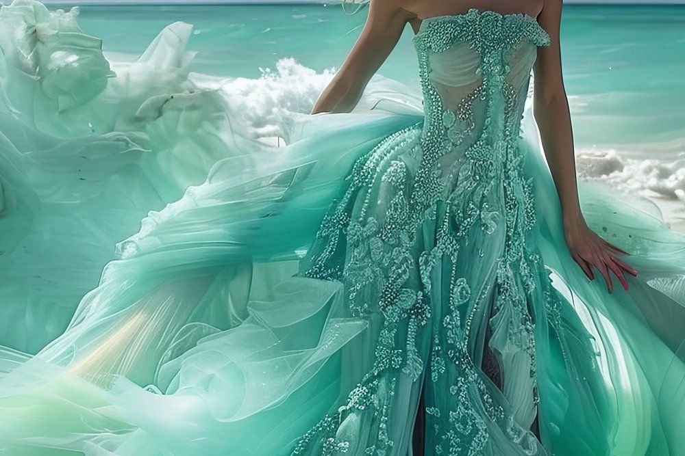 bruid in de branding waarbij haar jurk overgaat in de golven van de zee ai
