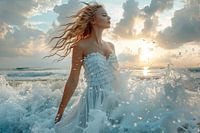 bruid in de branding waarbij haar jurk overgaat in de golven van de zee