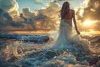 bruid in de branding waarbij haar jurk overgaat in de golven van de zee met dramatisch licht