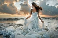 bruid in de branding waarbij haar jurk overgaat in de golven van de zee met dramatisch licht