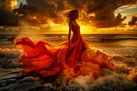 bruid in de branding waarbij haar jurk overgaat in de golven van de zee met dramatisch licht