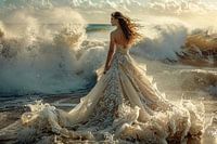 bruid in de branding waarbij haar jurk overgaat in de golven van de zee