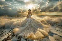 bruid in de branding waarbij haar jurk overgaat in de golven van de zee