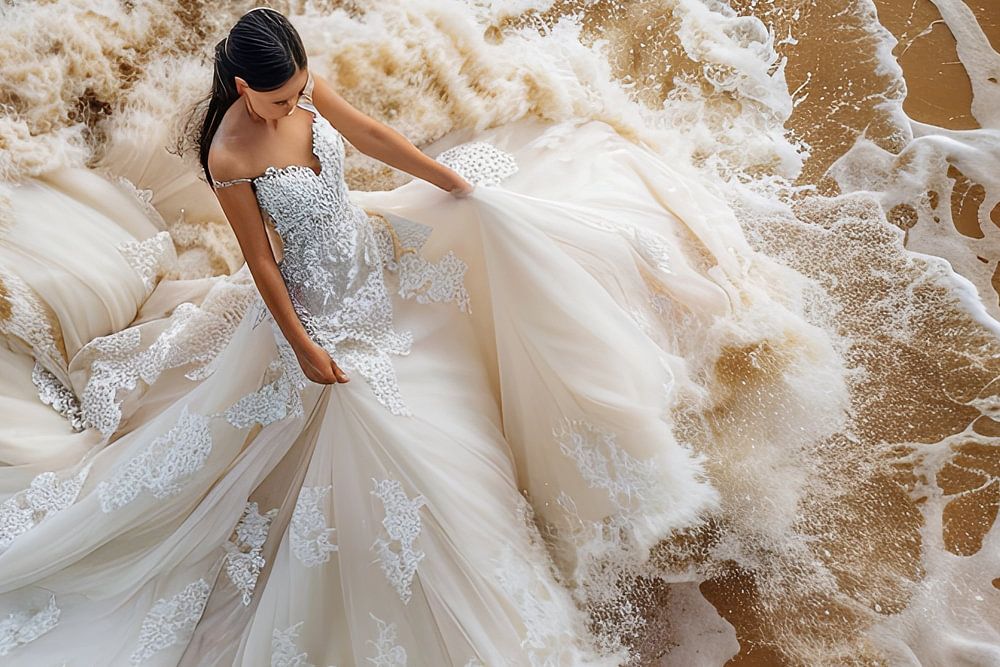 Digitaal beeld van fictief persoon. Bruid met bruidsjurk in het zeewater aan de kust