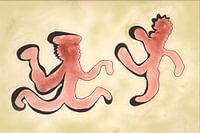 Een aquarel met veel verschillende vrolijk dansende wezentjes. Deze zijn zacht bruin met warm groen er omheen.