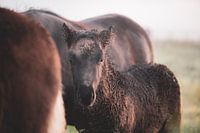close up van een donkerbruin veulen, dat bij zijn moeder in de wei staat, met een natte vacht door de ochtendmist
