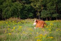 grasveld met raapzaad waar een bruine koe rustig aan het herkauwen is, en aan het genieten van de avondzon