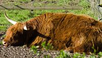 In het voorjaarszonnetje ligt deze schotse hooglander met de enorme hoorns lekker te dutten in het weiland.