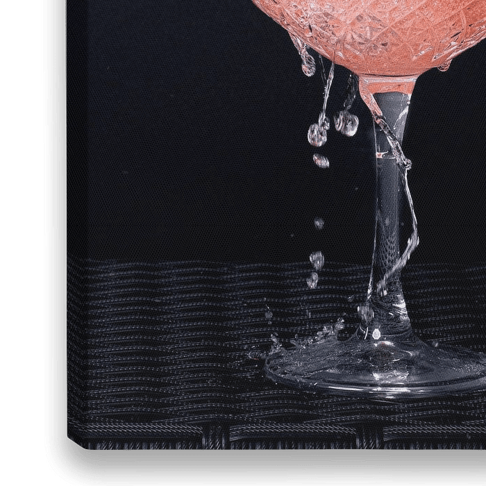 Dit stilleven van bubbels, in een mooie roze kleur in een glas schenken, is een plaatje om te zien, er gebeurt wat. Je blijft er naar kijken door de druppels onder het glas, mooi voor in een keuken of een restaurant.