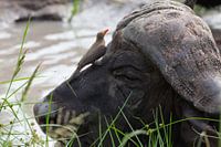 buffel in het kruger park met een ossepikker op zijn hoofd. gefotografeerd in zuid afrika