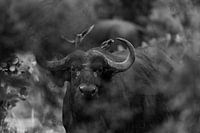 kafferbuffel gefotografeerd in zuid afrika, kruger park en uitgevoerd in zwart wit.