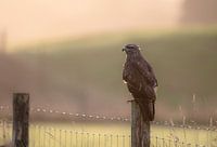 Close up van een buizerd bij de uiterwaarden van Heteren, op de Overbetuwe in Gelderland. De roofvogel zit in het gouden licht van de opkomende zon op een paaltje. De foto is gemaakt met een telelens.