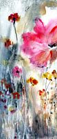 Bloemenschilderij met klaprozen in aquarelverf en grafische elementen. Een kleurrijk en expressief bloemenbeeld voor in de woonkamer. Het straalt optimisme en vrolijkheid uit. De schoonheid van de natuur is altijd een onuitputtelijke bron van inspiratie. Bloemenfantasieën zijn kunstig geënsceneerd. Perfect voor een liefhebber van romantiek.