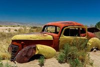 Een chevrolet, autowrak die al heel lang stil staat in de woestijn van namibië vlakbij het beroemde plaatsje solitaire inclusief pomstation.