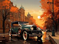 clip-art poster weergave van een oude vintage auto uit de 20ste eeuw voor oude gebouwen tijdens een late nazomerse middag.
