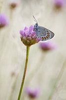 close up van een slapend heideblauwtje op engels gras op een voormalig belgisch zinkterrein in de lente