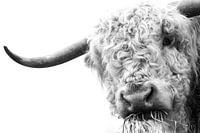 close up van een schotse hooglander in zwart en wit fotografie, Stoer en indringend zwart-wit portret van de robuuste Schotse Hooglanders die in de Maasduinen de heidevelden begrazen.