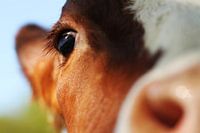 Koeienkop van dichtbij met fijn zonlicht en het detail op het oog en de wimpers