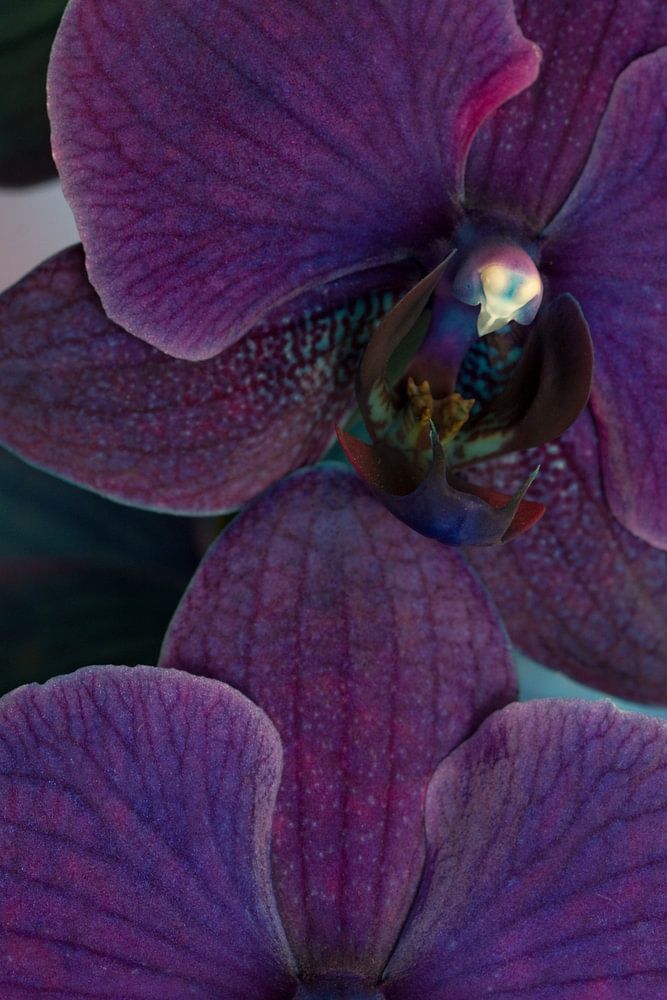 closeup van een paarse orchidee tegen een regenboog achtergrond