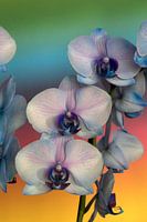 closeup van een roze orchidee tegen een regenboog achtergrond