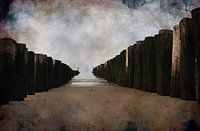 Donkere wolken boven een typische rij Zeeuwse strandpalen.
