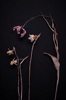 compositie van gedroogde bloemen op zwarte ondergrond. Nieuwsgierige tulp buigt zich over kleine narcisjes