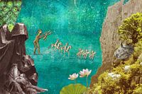 liggende collage in zeeblauwe, groene en bruine tinten, zicht op een zee waarop kleine krijgertjes lopen, te voet en te paard,…