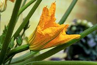 courgettebloem op een plant in de moestuin, geselecteerde focus, smalle scherptediepte