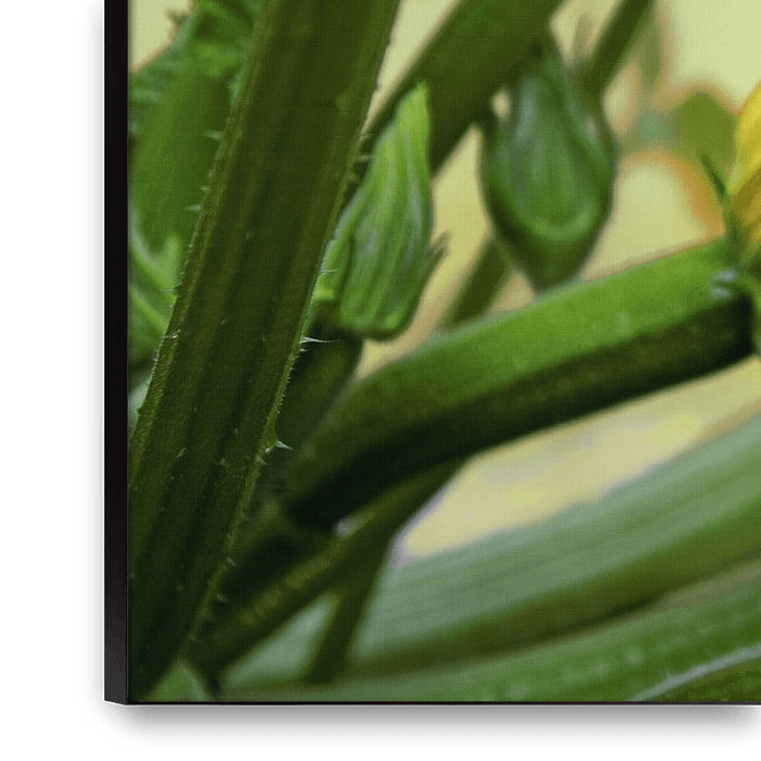 Koop dit bloemen kunstwerk courgettebloem op een plant in de moestuin, geselecteerde focus, smalle scherptediepte van Maren Winter op canvas, aluminium dibond, (ingelijste) fotoprint, behang en ArtFrame, op maat geprint in Fine-Art kwaliteit.