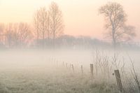 Op een ijzige ochtend hangt er bij dageraad mist over het grasland met een prachtige boom