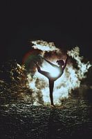 De combinatie van het licht, de rook of mist in de achtergrond en de precieze lijnen van de danspose creëert een etherele en betoverende sfeer. Dit beeld straalt kracht, balans en gratie uit. Wat een inspirerende expressie van kunst en beweging!