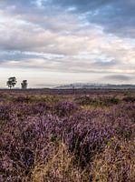Portret op natuurgebied de Ginkel in Ede, op de Veluwe in Gelderland, met zicht op de bloeiende heide onder een bewolkte lucht. Op de achtergrond zie je een bos met sparren, gehuld in nevel.