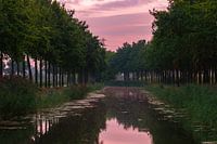 rivier de Linge bij dageraad, op het moment voor de zon opkomt, waardoor de lucht paarst kleurt, ook wel het blauwe uur genoemd