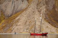 De tweemaster De Noorderlicht is een zeilschip dat rondvaarten maakt op Spitsbergen. Hier gefotografeerd in een fjord tegen een grote berg waardoor de kleur van het schip prachtig afsteekt.