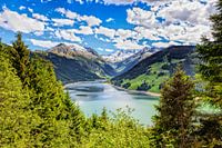 Een prachtig vergezicht van de bergketen de Alpen in de zomer met een stuwmeer en zijn besneeuwde bergtoppen, De Alpen bevinden zich ondermeer in de landen Oostenrijk , Italië , Frankrijk en Zwitserland.