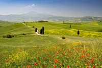 In de zachte ochtendstond, genesteld in de eindeloze uitgestrektheid van de Val d'Orcia, wordt een schilderachtig schilderij van de natuur onthuld. Het zonlicht breekt zachtjes over de Toscaanse heuvels, haar gouden stralen roepen een gloedvol spel op van schaduw en licht. Voor dit majestueuze panorama dansen de klaprozen als vlammende vonken in de wind, hun felrode koppen trots oprijzend naar de opkomende zon.