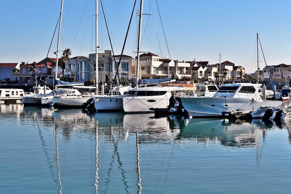 Landschap met de jachthaven op Harbour Island in Gordons Bay