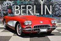 amerikaanse cult oldtimer in klassiek rood-wit en als cabriolet bij de voormalige Berlijnse muur