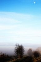 Op deze mistige herfstochtend is zon al op maar de maan staat nog hoog aan de hemel te schijnen. Waarschijnlijk om te kijken hoe mooi het uitzicht nu is. Diep blauwe lucht met veel wolken stromingen en laag bij de grond mist. Het geheel doet je denk aan een betoverend bospaadje.