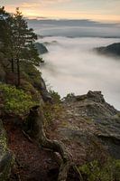 Uitzicht in het mistige dal, bij zonsopgang in Saksisch Zwitserland, op een laatste novemberdag, nabij het stadje Brand in Saksen.
